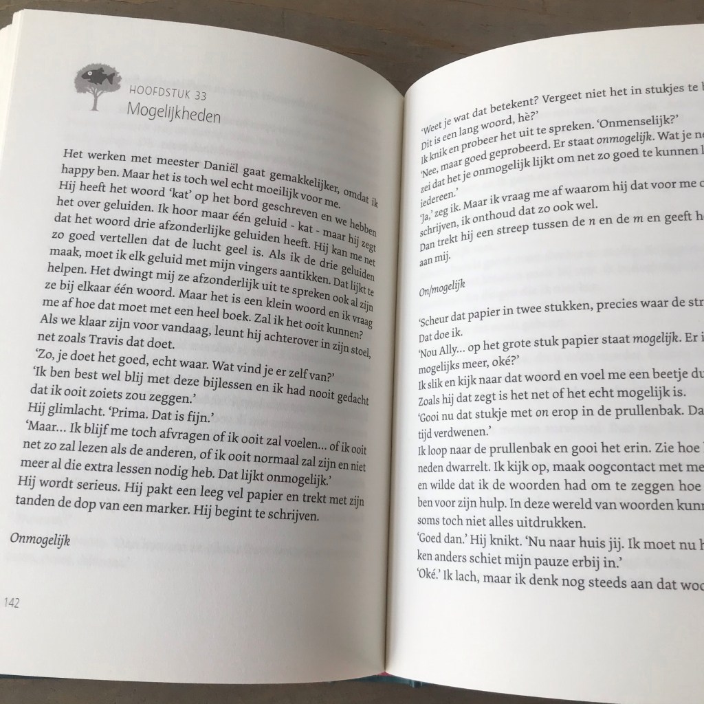 Maar dan komt meester Daniël. Dat blijkt de redding voor Ally. Meester Daniël heeft oog voor haar, hij ziet haar écht. Hij ontrafelt haar geheim en laat haar onderzoeken. Ze heeft dyslexie. Haar meester vertelt in de klas dat grote denkers en geniën ook vaak dyslectisch waren. Ally’s zelfvertrouwen groeit. Ze leert schaken en stapje voor stapje ook lezen. Haar meester benadrukt dat Ally heel creatief is en veel andere talenten heeft. En als bonus krijgt Ally ook twee vrienden in de klas: Albert (vernoemd naar Einstein natuurlijk) en Keisha. De pesterijen stoppen zodra Ally wordt gekozen tot klassenvertegenwoordiger.