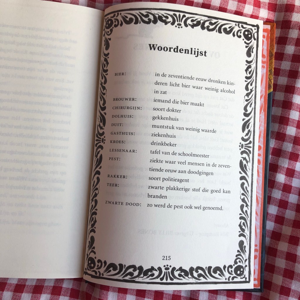 Het was een donkere tijd, een tijd van armoede en strenge straffen. Waarom droeg een pestdokter – zoals afgebeeld op de voorkant – zo’n eng vogelmasker? En wat is de pest nou eigenlijk? Daar krijgen we in dit boek geen antwoord op. Het is natuurlijk ook geen informatief boek, maar ik denk wel dat het vragen oproept bij kinderen. Ook thema’s als de positie van de vrouw/meisjes, beroepen in de 17e eeuw en het leven in het weeshuis komen aan de orde. Achterin het boek staat een kort woordenlijstje waar woorden als ‘rakkers’ en ‘chirurgijn’ worden uitgelegd. Mooi om aan de thema’s en de moeilijke woorden in de klas aandacht aan te kunnen besteden!