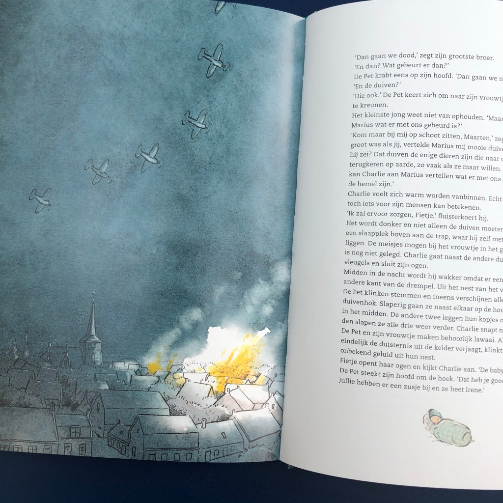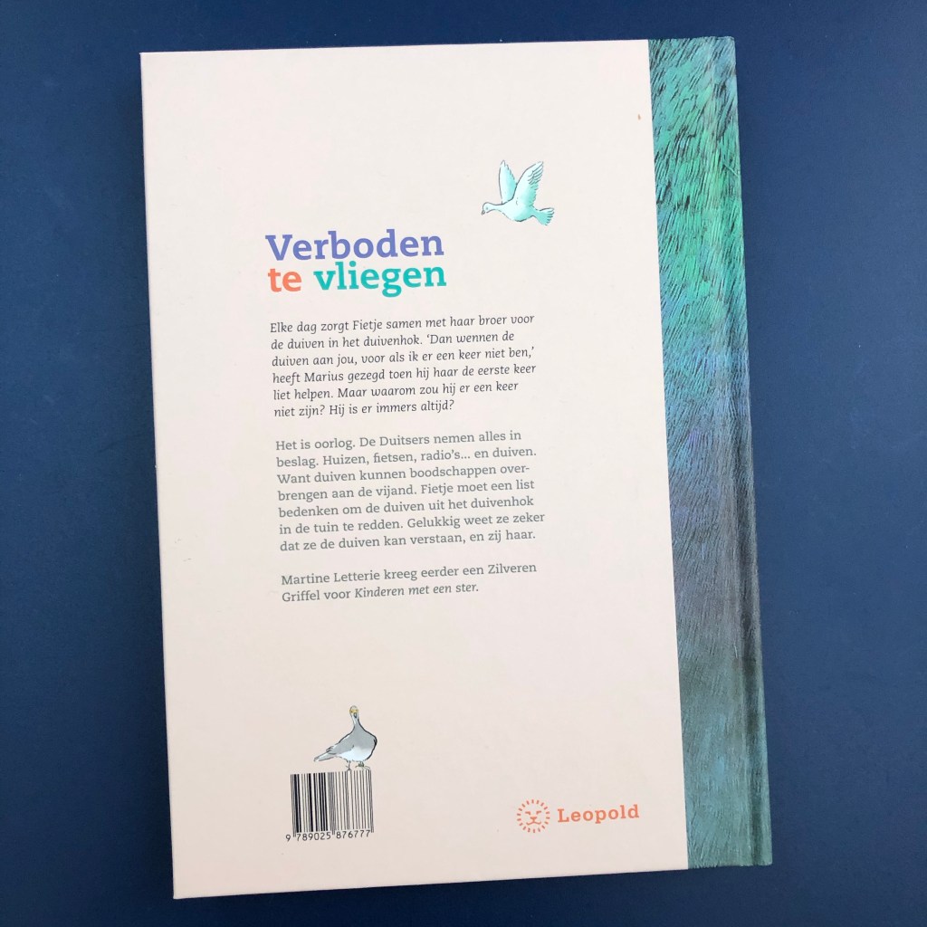 Het boek Verboden te vliegen (2019) vertelt juist over een groot gezin in Brabant en hun ‘gewone’ leven in de oorlog in drie periodes: voor, tijdens en na de oorlog. Het verhaal wordt verteld vanuit het perspectief van Fietje Fiedel én vanuit haar postduiven. Het is even wennen, je inleven in een postduif, maar het is heel grappig om ‘mee te vliegen’ op de vleugels van een duif. Duiven spelen een belangrijke rol in het verhaal, want in de Tweede Wereldoorlog werden duiven in beslag genomen: ze konden misschien boodschappen overbrengen aan de vijand.