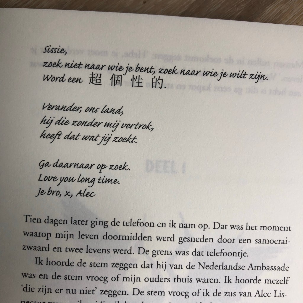 Elk hoofdstuk begint met een quote, een plaatsnaam en een jaartal. Ze komen van de kaarten die Alec naar zijn zus stuurde op zijn reizen. Toen Alec naar Tokio ging, kreeg Hebe bij hun afscheid ook een kaart met een haiku die hij voor haar had geschreven. Het is cryptisch: Hebe weet niet wat ze ermee aan moet. Maar dat ze naar Tokio moet, is wel duidelijk.