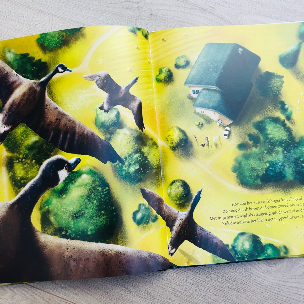 Kim neemt ons mee als verteller met allerlei dieren die allemaal op verschillende manieren vliegen. De platen zien er prachtig uit! Vooral het perspectief verrast steeds: je ervaart echt hoe het is om van bovenaf dingen te bekijken. De koolmees ziet de koe op zijn rug, de ganzen zien een huis als een poppenhuisje.