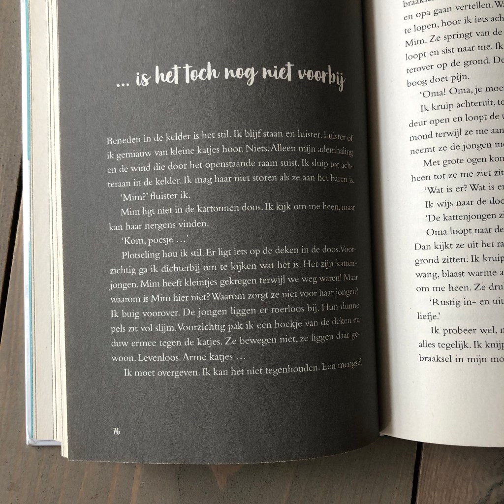 Een boek dat de dood ademt zonder dat het te zwaar wordt. Een troostrijk boek voor kinderen die rouwen om een dierbare. In het boek wordt door de 11-jarige hoofdpersoon die in de zomer bij haar opa en oma logeert nadat haar vader is overleden, meermaals de ingewikkelde vraag gesteld: waarom gaat iedereen om me heen dood? De dood is altijd aanwezig in het leven: een bruinvis die aanspoelt, een kat die dode kittens ter wereld brengt. Het is verdrietig, maar je moet ermee leren omgaan. Dit boek helpt daarbij en het is prachtig geschreven. Rustig, langzaam, met zinnen die je nog een keer wilt lezen.