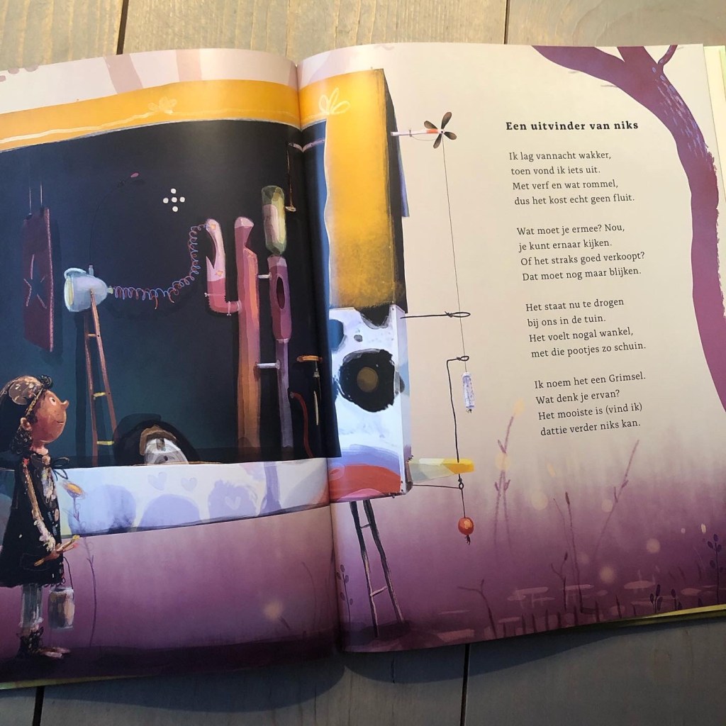 Hier dus niet! De gedichten en illustraties horen bij elkaar. Ze vertellen samen een verhaal. Een verhaal over een kind dat dingen wil uitvinden, ook al weet hij eigenlijk niet waar het voor is, of het kind dat liever onzichtbaar een boom is in een musical. Een kind met een hoofd vol ideeën dus, maar ook een kind dat zich juist graag terugtrekt.