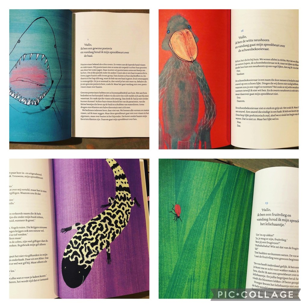 Bibi Dumon Tak is grootmeester in het schrijven van informatieve dierenverhalen waar je écht iets over dieren leert. Én er valt altijd iets te lachen. In dit ‘spreekbeurtenboek’ vertellen dieren iets over een ander dier. Dieren die iets met henzelf te maken hebben, zoals de mol en de langpootmug. Mollen zijn namelijk dól op de larven van de langpootmug. Sommige dieren vertellen over dieren die op hen lijken, die ze supercool vinden of die ze graag helpen. Zoals de gewone poetsvis die enorm belangrijk is voor de haai, want anders zou die haai er maar verfomfaaid uitzien. En de sneeuwpanter houdt een spreekbeurt over zichzelf: “de reden daarvoor is dat niemand ons ziet staan. Wij zijn onzichtbaar en daarom lijkt het alsof wij er niet zijn.”