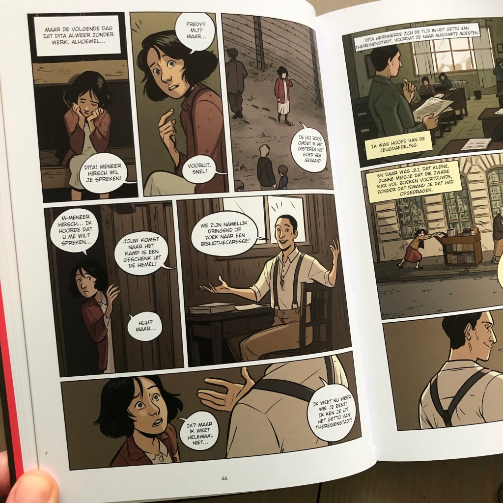 De oorspronkelijke Spaanstalige roman La Bibliothecaria de Auschwitz is een bestseller die al verscheen in 2012 en ruim 400 pagina’s telt. Bij uitgeverij Fontein verschijnt op 11 maart de graphic novel voor 13+, gebaseerd op dit verhaal, waarbij grote stukken zijn ingedikt of weggelaten.