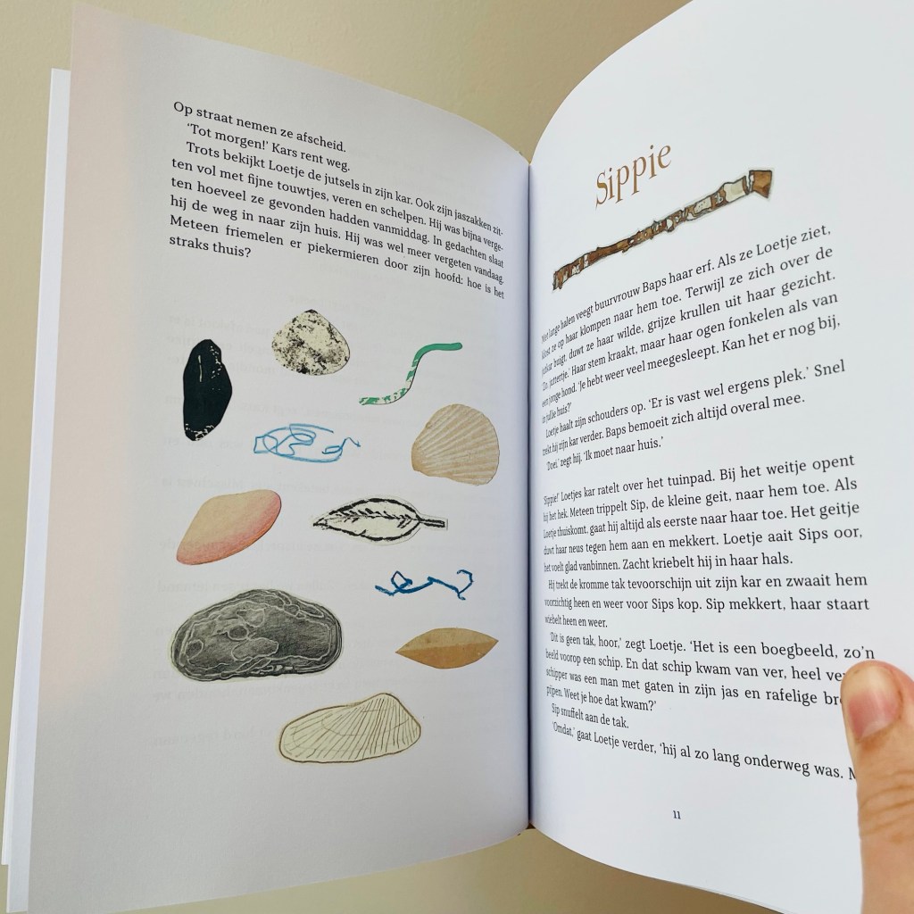 Illustrator Tineke Meirink kennen we van het schitterende boek Wij zijn even naar de verte. Daarin spelen de fantasiefiguren, gemaakt van gevonden dingen zoals stenen, schelpen, stukjes hout en plastic, de hoofdrol. Ook in dit boek maken Loetje en Wiets deze figuren, ze noemen ze strandschilderijen. Ze vertellen een verhaal, en helpen Loetje om te verwerken wat hij allemaal meemaakt.