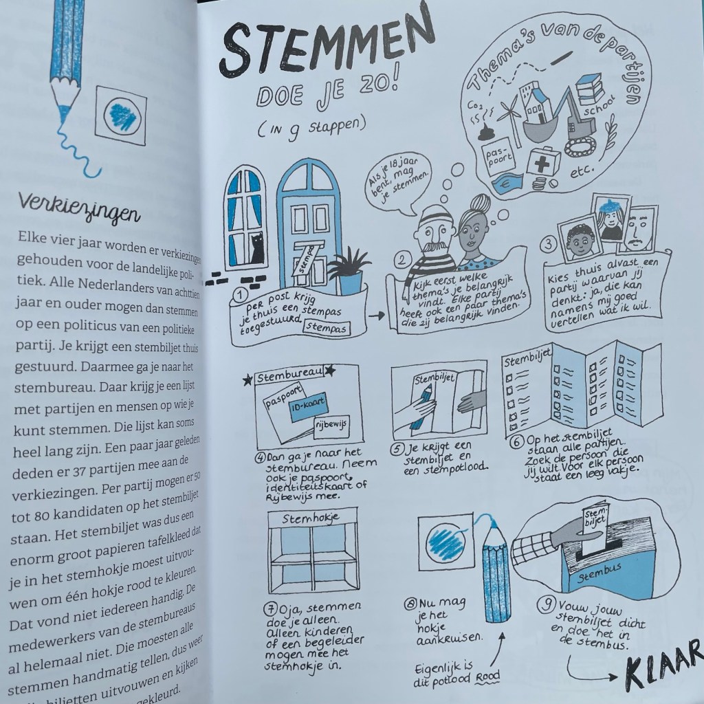 Maar Arwen Kleyngeld legt ook uit dat je als kind of volwassene niet elke dag met alles mee kunt denken. We hebben een volksvertegenwoordiging gekozen, en deze politici nemen beslissingen voor ons. Gelukkig maar, anders zouden kinderen geen tijd meer over hebben om te spelen en te lezen! Er wordt duidelijk verteld wat het verschil is tussen de eerste en de tweede kamer, de koning, ministers, staatssecretarissen, de gemeenteraad enzovoort.