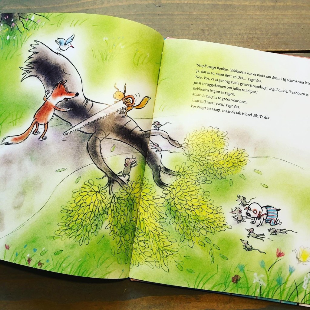 Dat blijkt nog best ingewikkeld! Hier worden jonge kinderen uitgedaagd om mee te denken met Bonkie en Vos. Het blijkt een opeenstapeling van gebeurtenissen: Beer en Das maken ruzie: Eekhoorn schrikt daarvan en er breekt een tak af van een grote boom als hij wegvlucht, de tak komt op het muizenhol terecht, Eekhoorn valt bovenop Evert het zwijntje… Nu Bonkie en Vos weten hoe het zit, kunnen ze een oplossing bedenken.