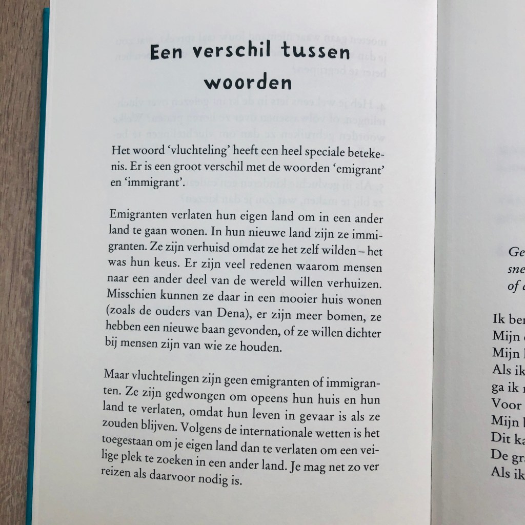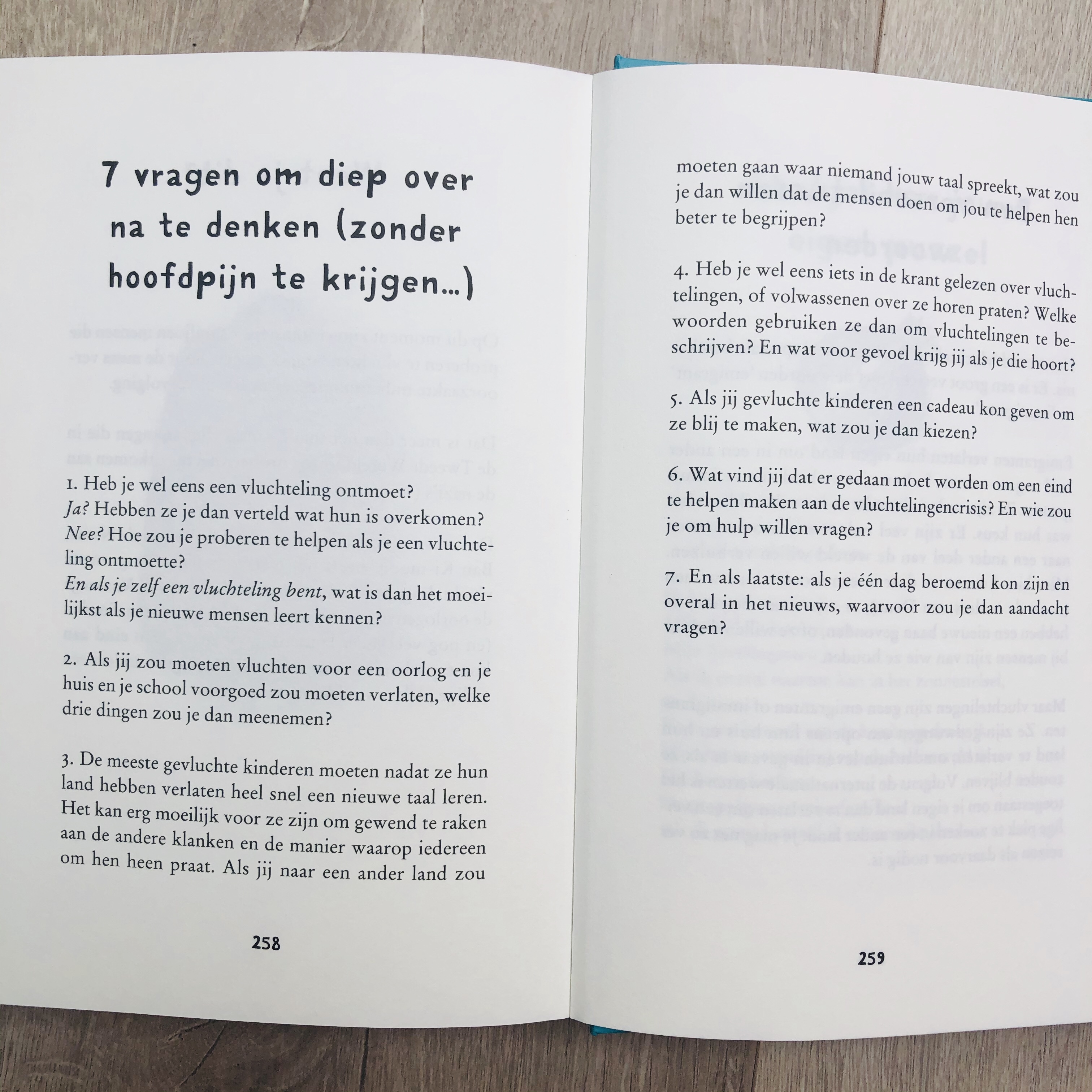 Een heerlijk leesboek voor nieuwsgierige jonge lezers vanaf 8 jaar. Simpel en soepel geschreven, soms wel erg ‘uitleggerig’, maar ook ontroerend naïef. De schrijver heeft een duidelijke boodschap met dit boek: meer bekendheid geven aan het begrip ‘vluchteling’ en het onderwerp bespreekbaar maken.